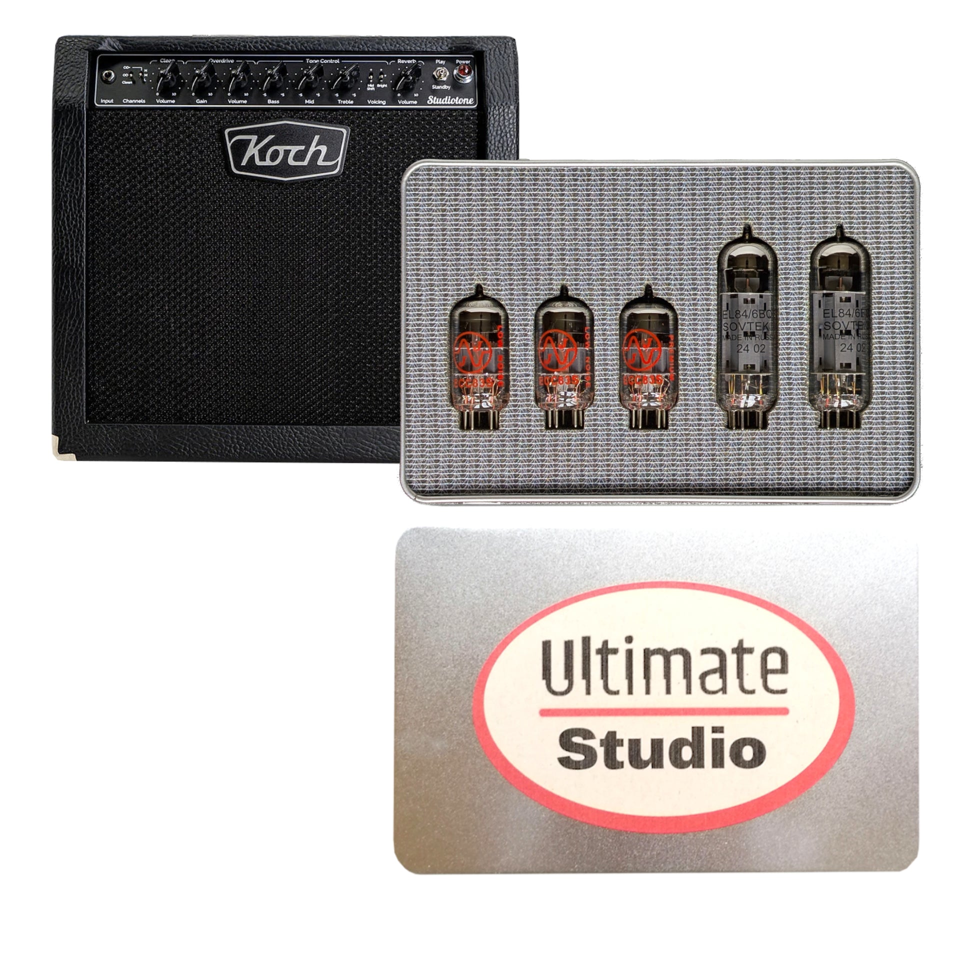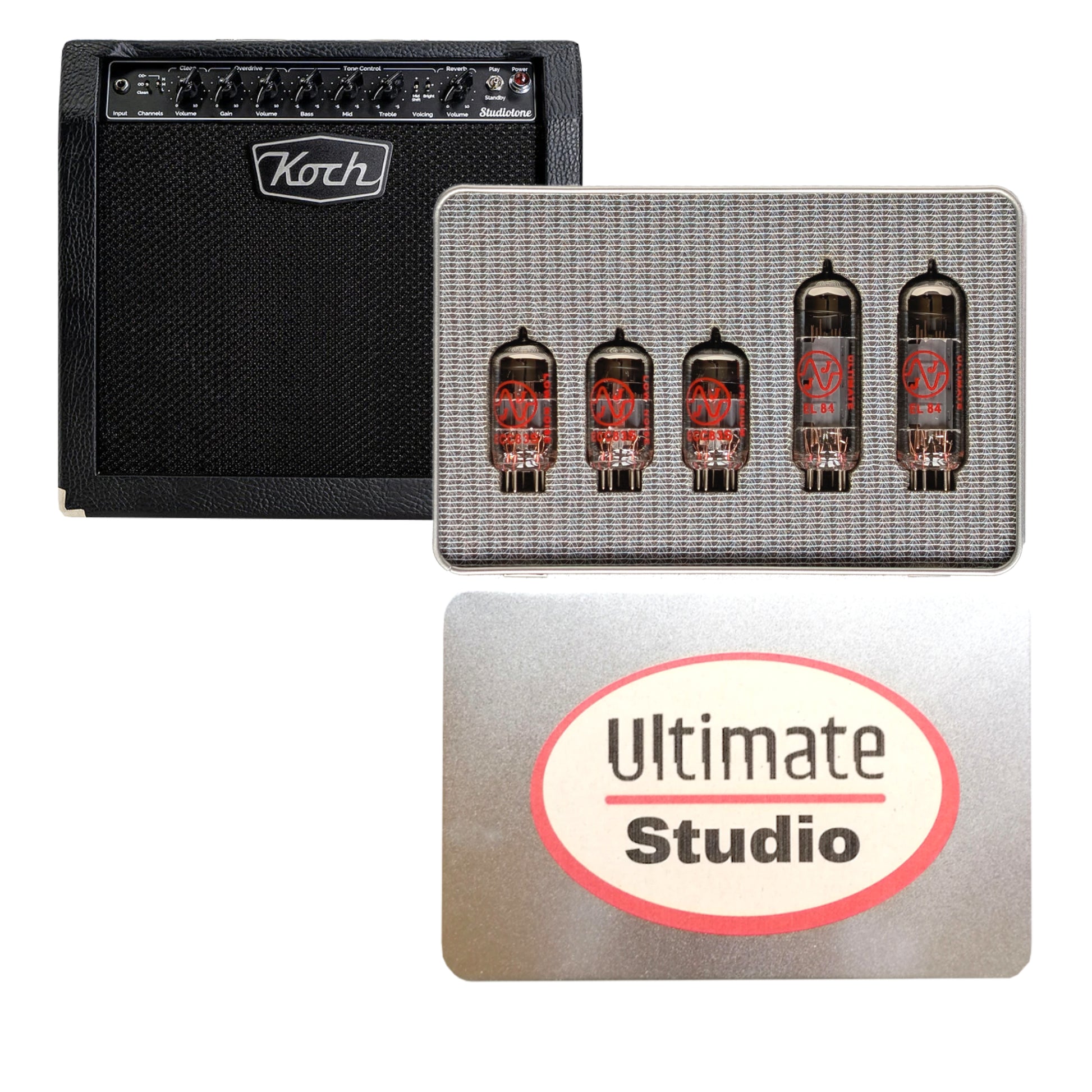 Le Koch Studiotone est un combo à lampes de 20 watts construit aux Pays-Bas — une marque confidentielle mais réputée chez les connaisseurs pour la qualité de sa fabrication. Trois canaux commutables, une réverb à ressort, une boucle d'effets, et un haut-parleur 12 pouces Koch maison : c'est un ampli complet et polyvalent, aussi à l'aise en répétition qu'en concert ou en studio.